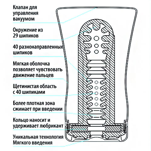 Мастурбатор будет многократно усиливать любое движение Ваших пальцев и порождать целую гамму разнообразных чувственных наслаждений. Мастурбатор имеет мягкий корпус и сложную внутреннюю структуру. Внутри находится более 70 усиков и пупырышек для стимуляции и ласок тела пениса и головки. Кроме того, уникальный дизайн мастурбатора создает ощущение посасывания, что еще больше усиливает наслаждение. Это достигается благодаря специальному отверстию для воздуха. Зажав отверствие пальцем, Вы создадите эффект помпы. Специальный резервуар со смазкой позволит сохранять вход мастурбатора всегда скользским и влажным.