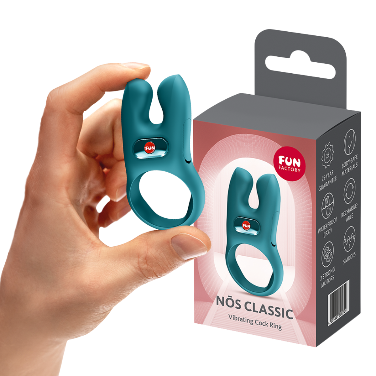 Эрекционное кольцо с двойной вибрацией Nos разработано с учетом мужской и женской физиологии. Продление и усиление эрекции у мужчины и точечная стимуляция околоклиторальной зоны у девушки. Пухлые удлиненные ушки разработаны специально с учетом строения клитора. А ловкость рук приберегите для других ласк.