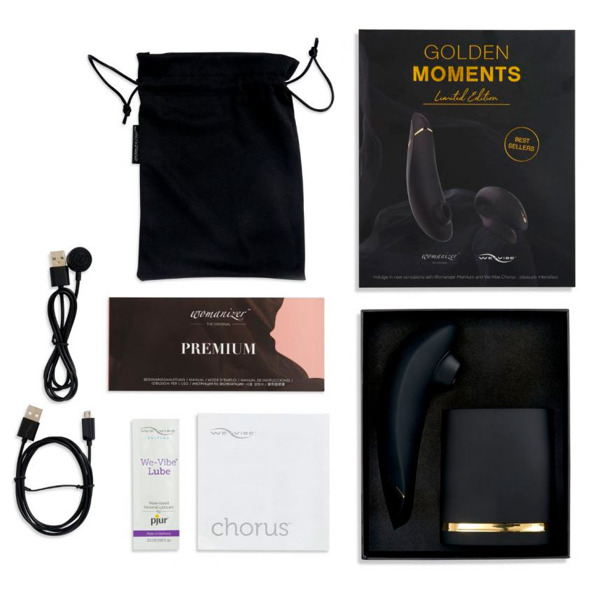 Подарочный набор в благородном черно-золотом цвете. В комплекте: We-Vibe Chorus и Womanizer Premium.
