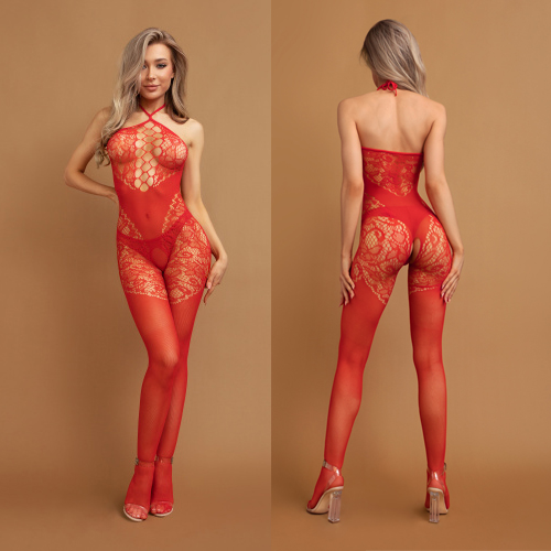 Яркий, броский и соблазнительный боди-комбинезон красного цвета, сочетающий в себе крупное переплетение сетки, кружева и плотных элементов определенно найдет отклик в сердцах. Фокус внимания начинается на груди, треугольная плотная часть на животе словно стрелка указывает направление движения взгляда к пикантным местам, обрамленных кружевом, навевая ассоциации о нежном, ценном, любимом.